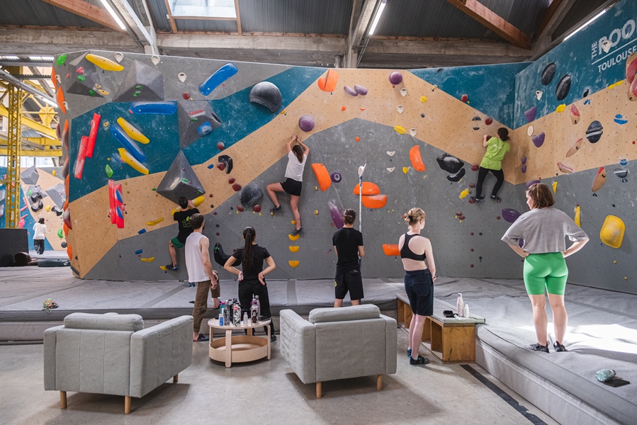L’espace grimpe de la grande salle est constitué de quatre grands frontons divisés en plusieurs secteurs. On y grimpe sur des murs allant jusqu'à 4,50 m de hauteur avec des profils différents : positif, dalle, dévers, proue ... Des blocs de niveau débutant à expert sont matérialisés par des codes couleurs permettant à chacun·e de découvrir la discipline et progresser à son rythme !